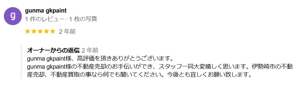 gunma gkpaint様、高評価を頂きありがとうございます。 gunma gkpaint様の不動産売却のお手伝いができ、スタッフ一同大変嬉しく思います。伊勢崎市の不動産売却、不動産買取の事なら何でも聞いてください。今後とも宜しくお願い致します。