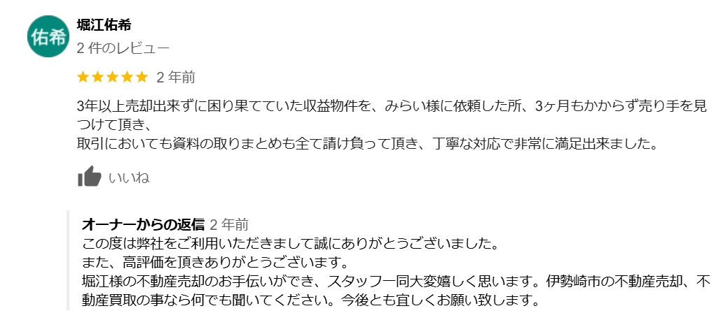 この度は弊社をご利用いただきまして誠にありがとうございました。 また、高評価を頂きありがとうございます。 堀江様の不動産売却のお手伝いができ、スタッフ一同大変嬉しく思います。伊勢崎市の不動産売却、不動産買取の事なら何でも聞いてください。今後とも宜しくお願い致します。