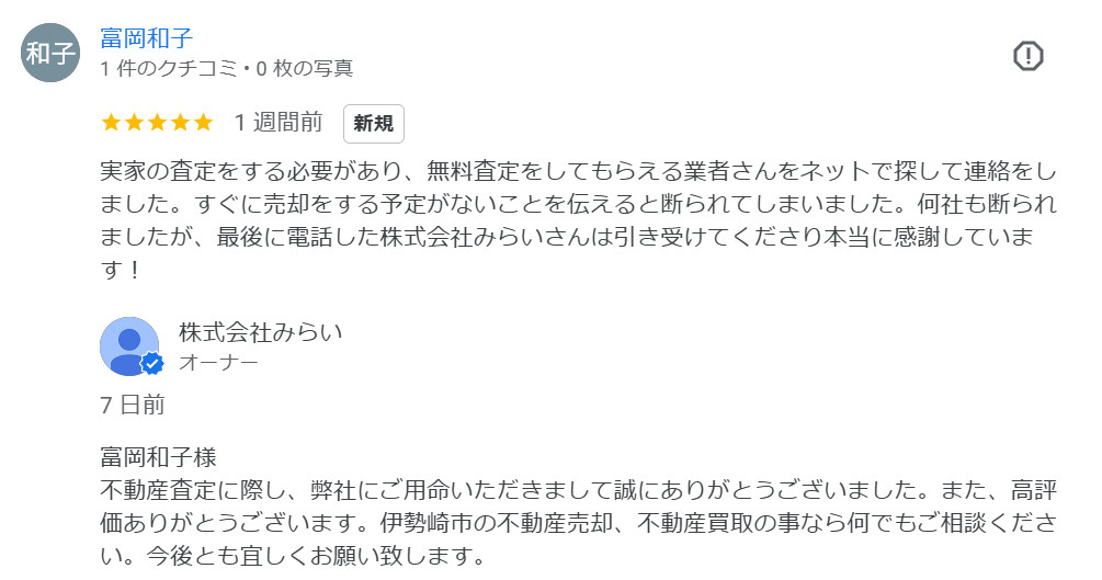 富岡和子様 不動産査定に際し、弊社にご用命いただきまして誠にありがとうございました。また、高評価ありがとうございます。伊勢崎市の不動産売却、不動産買取の事なら何でもご相談ください。今後とも宜しくお願い致します。