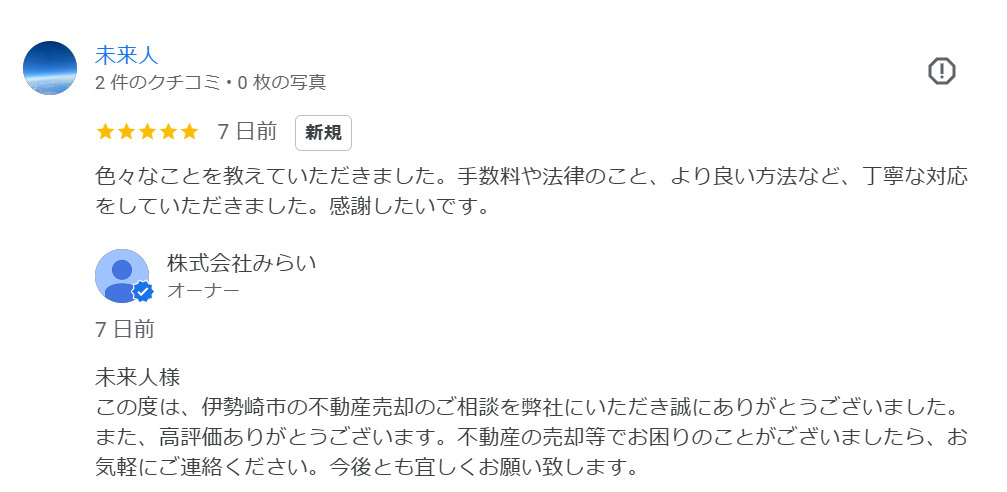 未来人様 この度は、伊勢崎市の不動産売却のご相談を弊社にいただき誠にありがとうございました。また、高評価ありがとうございます。不動産の売却等でお困りのことがございましたら、お気軽にご連絡ください。今後とも宜しくお願い致します。